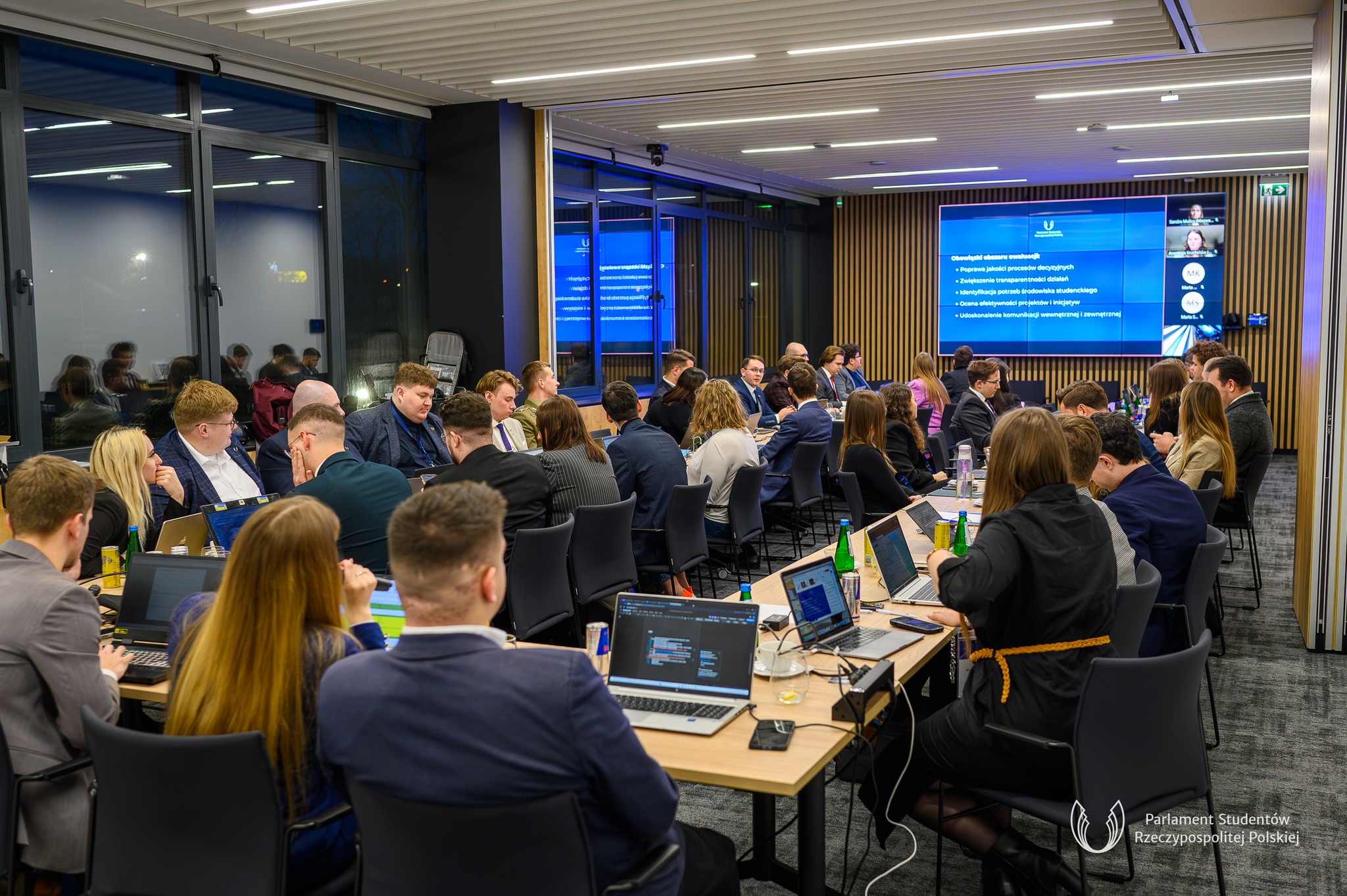 Dzięki uprzejmości samorządów – Rady Samorządu Studenckiego Uniwersytetu WSB Merito w Poznaniu, Parlamentu Studencki Uniwersytetu Ekonomicznego w Poznaniu i Samorządu Studentów Uniwersytetu im. Adama Mickiewicza w Poznaniu nasze pierwsze posiedzenie Rady Studentów kadencji 2025/2026 odbyło się w mieście koziołków i rogali! Obrady rozpoczęliśmy od debaty pt. „Szanse i zagrożenia środowiska studenckiego w perspektywie nadchodzących dwóch lat”. W jej trakcie poruszono kwestie dotyczące m.in. sytuacji socjalno-bytowej, zagrożeń technologicznych, zdrowia psychicznego, promocji samorządności studenckiej, szkolenia samorządów studenckich oraz współpracy samorządów studenckich z władzami uczelni.